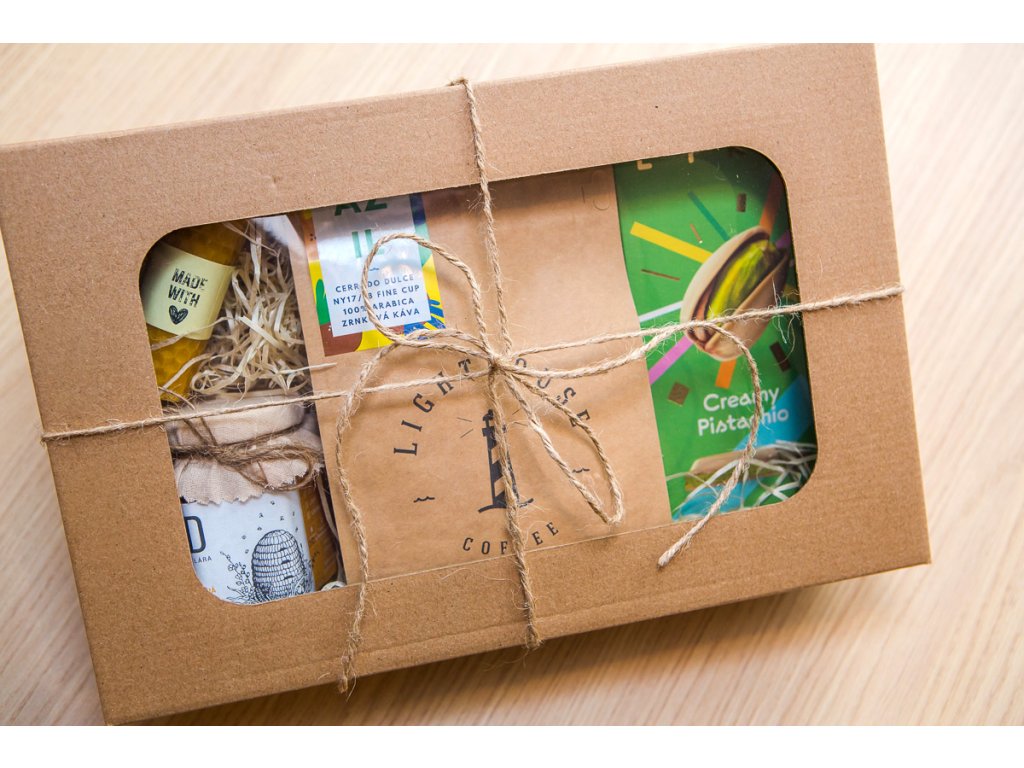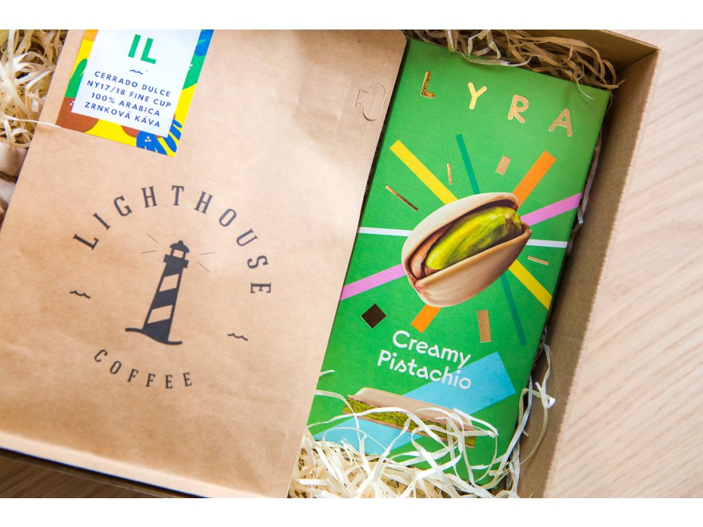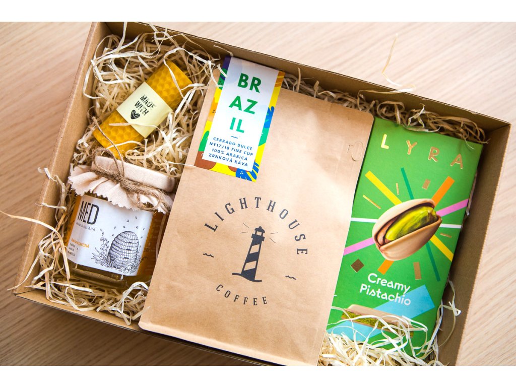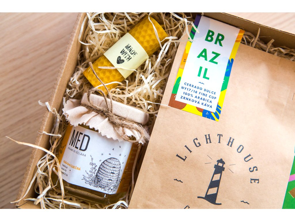 Lighthouse Coffee Brazil & Lyra Creamy & ručne robená sviečka a med od včelára: darčekový balíček