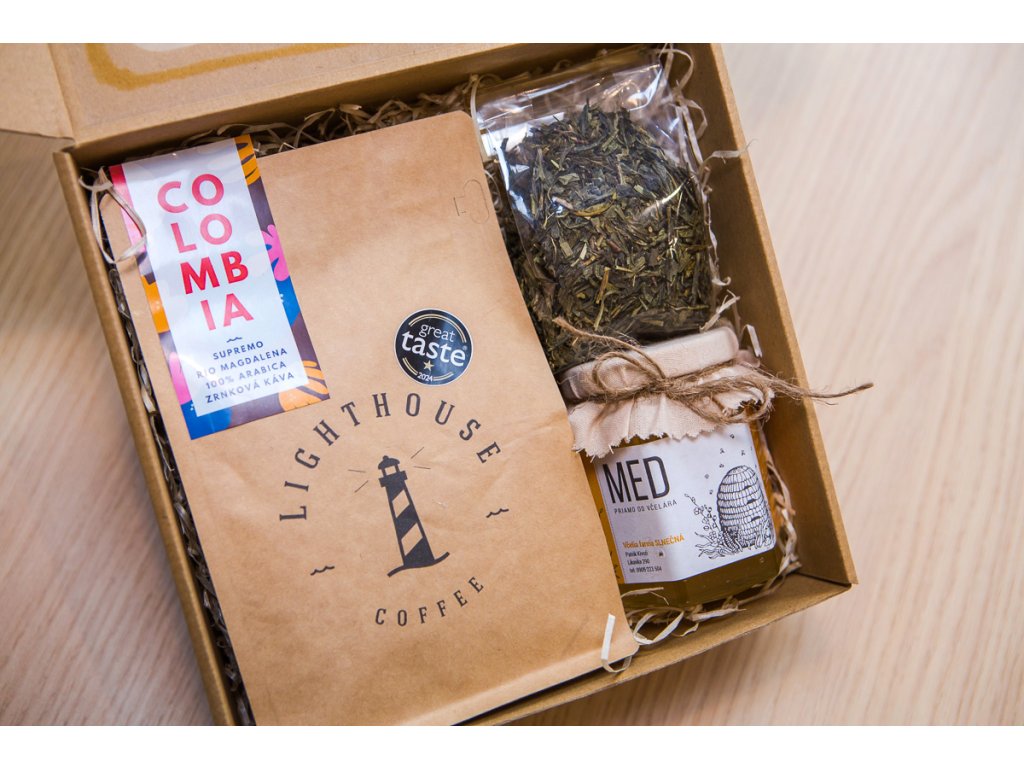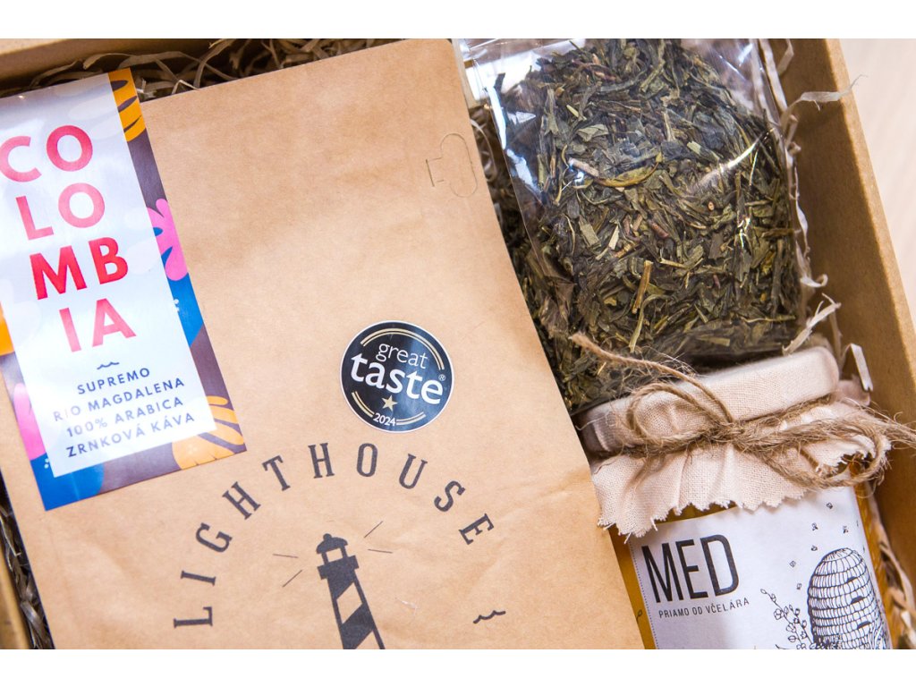 Lighthouse Coffee Colombia Rio Magdalena & Zelený čaj Sencha a med od včelára: darčekový balíček