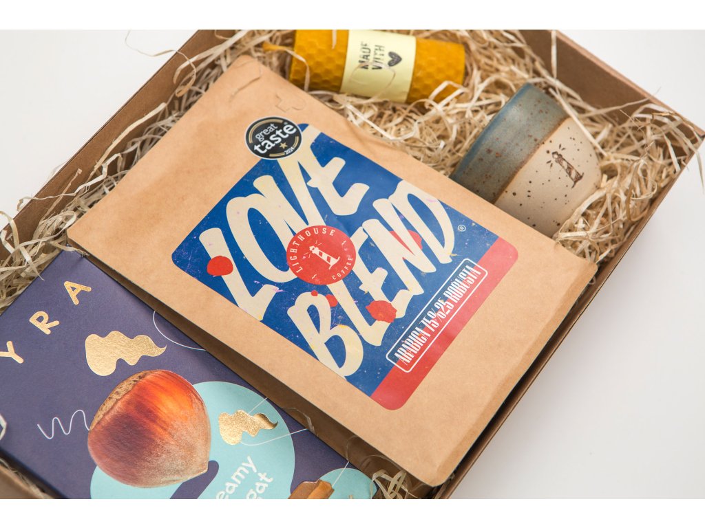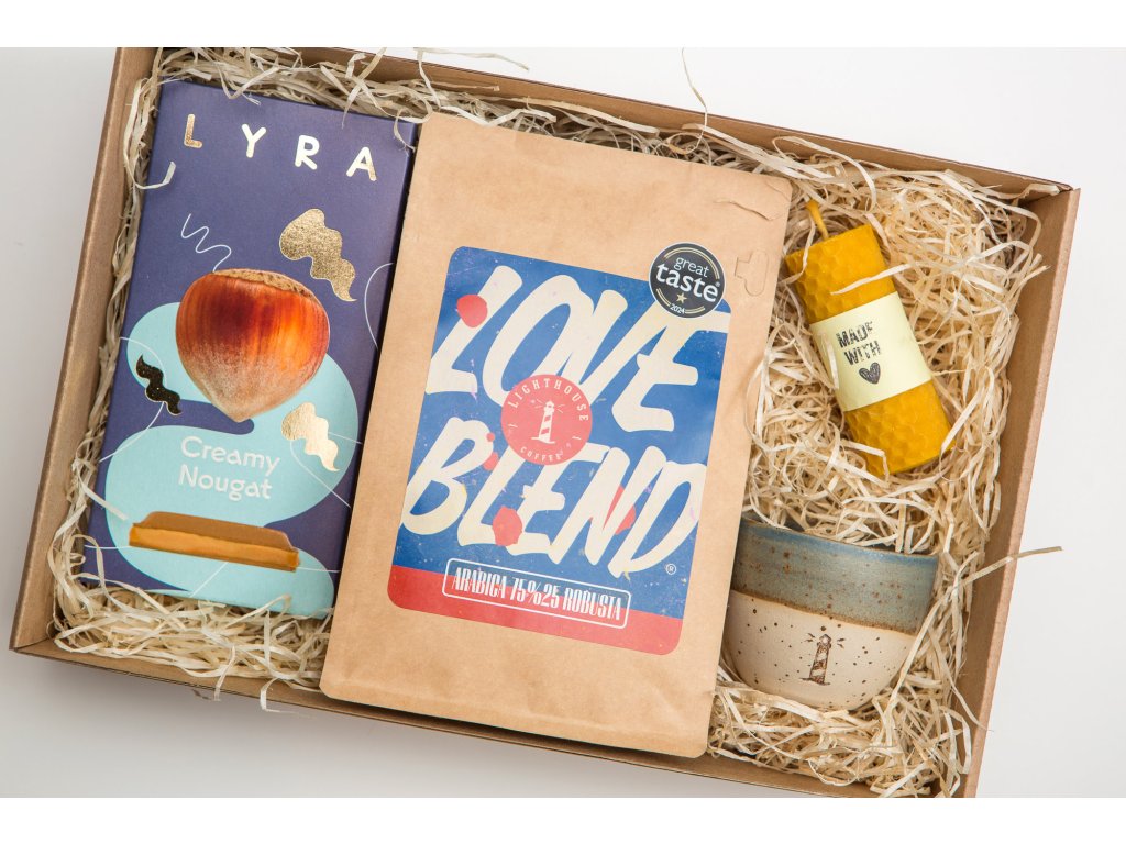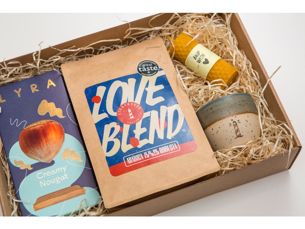 Skvelá, čerstvo pražená káva Lighthouse Coffee Loveblend 75/25 ocenená hviezdou na prestížnej svetovej súťaži Great Taste Awards, nádherná ručne točená keramická šálka, lahodná čokoláda Lyra Creamy Nugat a ručne robená voňavá sviečka z medzistienok pravého včelieho vosku.