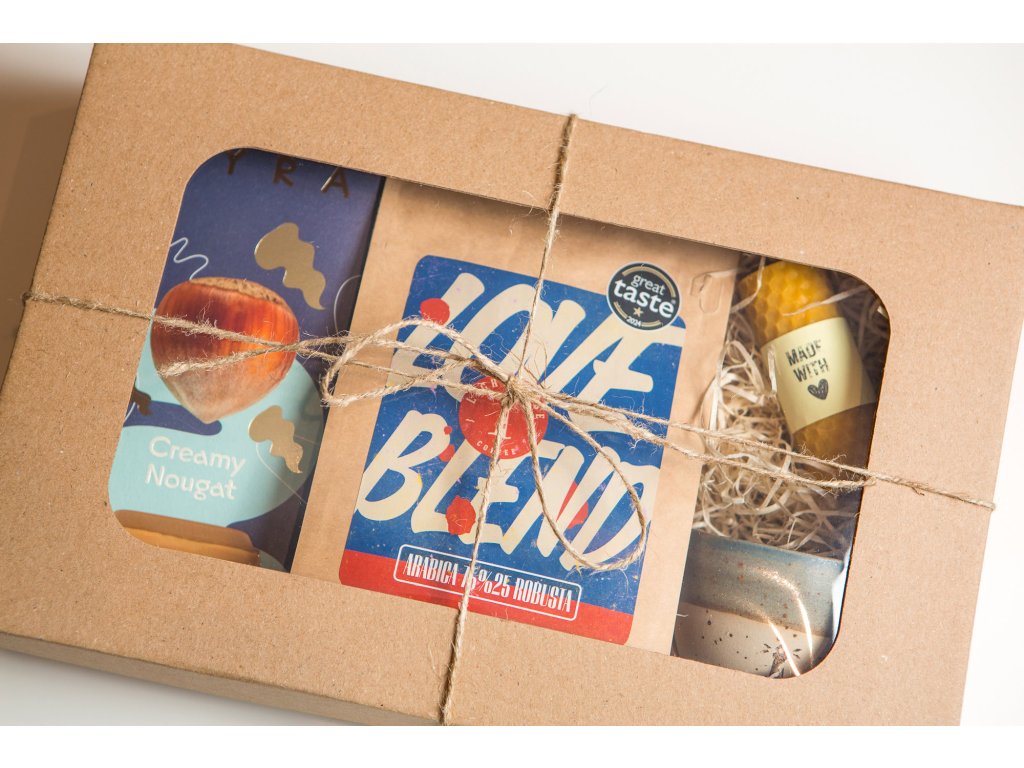 Balíček je zabalený v ekologickej papierovej krabici s okienkom, v ktorom produkty krásne vyniknú. Ako výplň používame drevitú vlnu a krabice previažeme jutovým motúzom.