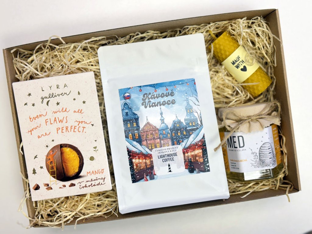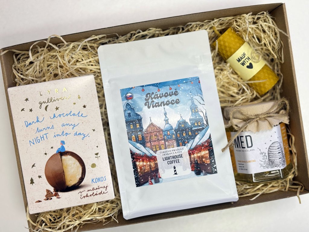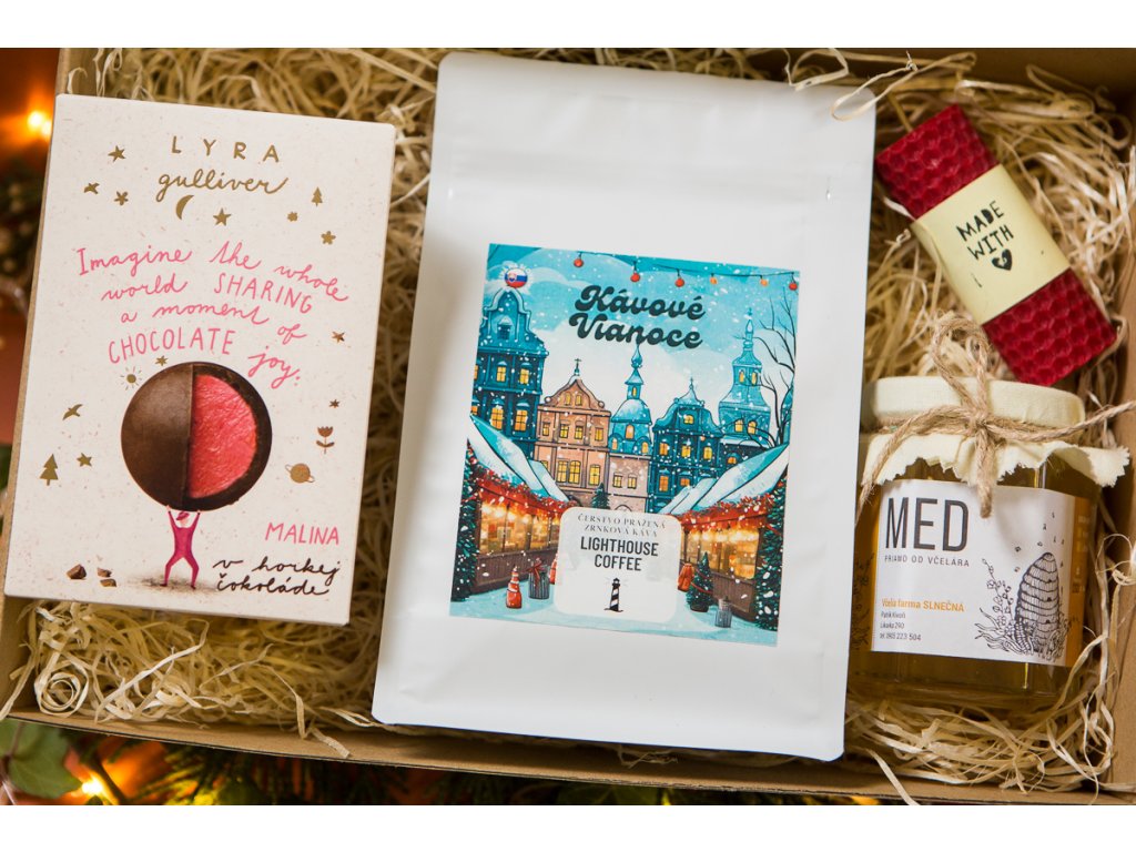 Lighthouse Coffee vianočný balíček & Lyra Gulliver & sviečka a med priamo od včelára: darčekový balíček