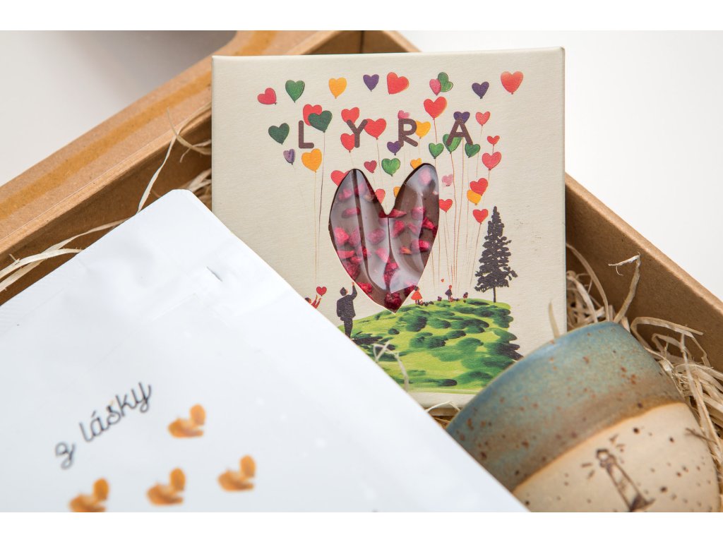 Aký by mal byť ideálny darček? Krásny, chutný a veselý! Skvelá, čerstvo pražená káva Lighthouse Coffee Z lásky Colombia Supremo Rio Magdalena ocenená hviezdou na prestížnej svetovej súťaži Great Taste Award, nádherná ručne točená keramická šálka a lahodná čokoláda Lyra Srdce s posypom malinových lupienkov.