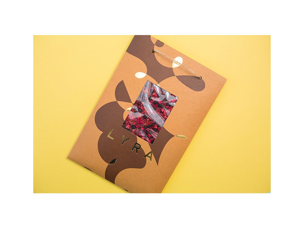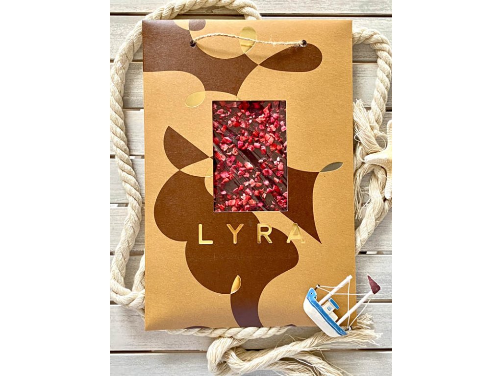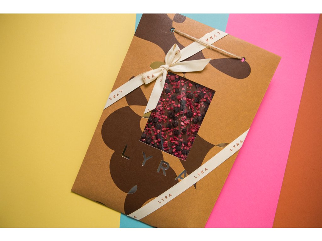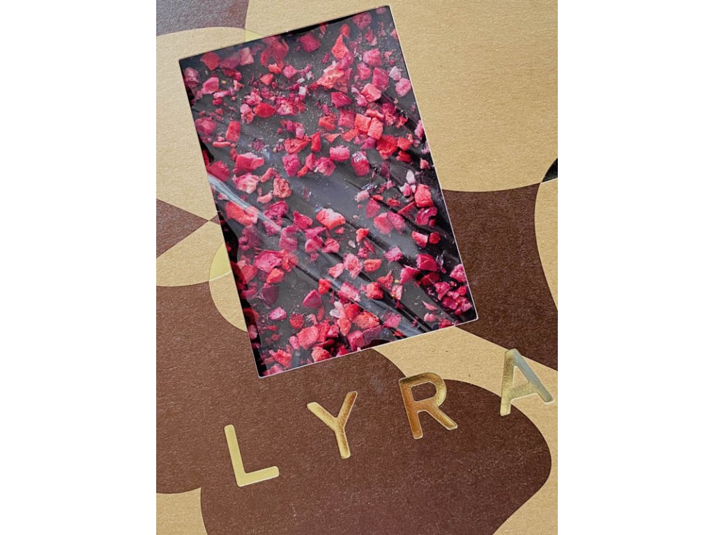 Poriadna porcia - najväčšia Lyra u nás - 300 gramov naozaj poctivej prémiovej kolumbijskej horkej čokolády posypanej ingredienciami ako lyofilizované jahody, maliny, fialkové kvety, ružové kvety, mätové lístky.