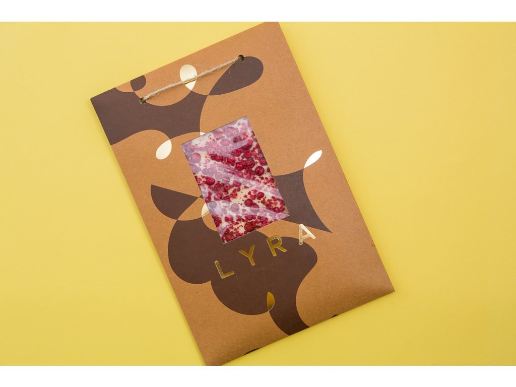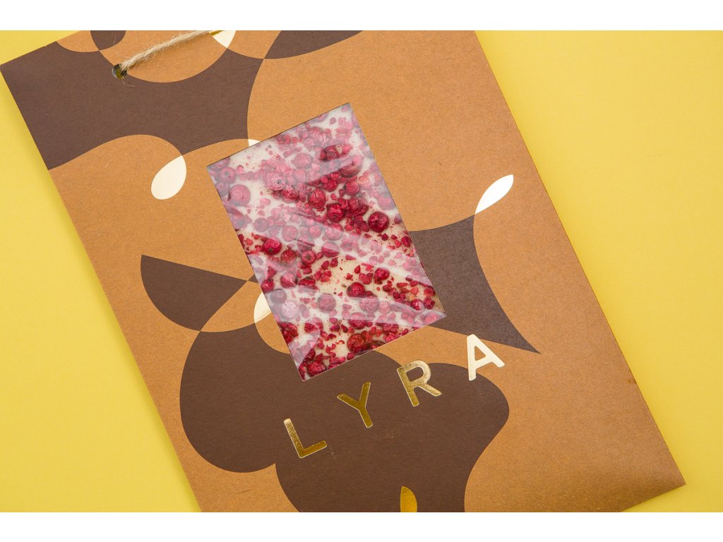 Poriadna porcia - najväčšia Lyra u nás - 300 gramov tej najjemnejšej kolumbijskej bielej čokolády posypanej lyofilizovanými jahodami, malinami, pomarančovou kôrou, fialkovými alebo ružovými kvetmi.