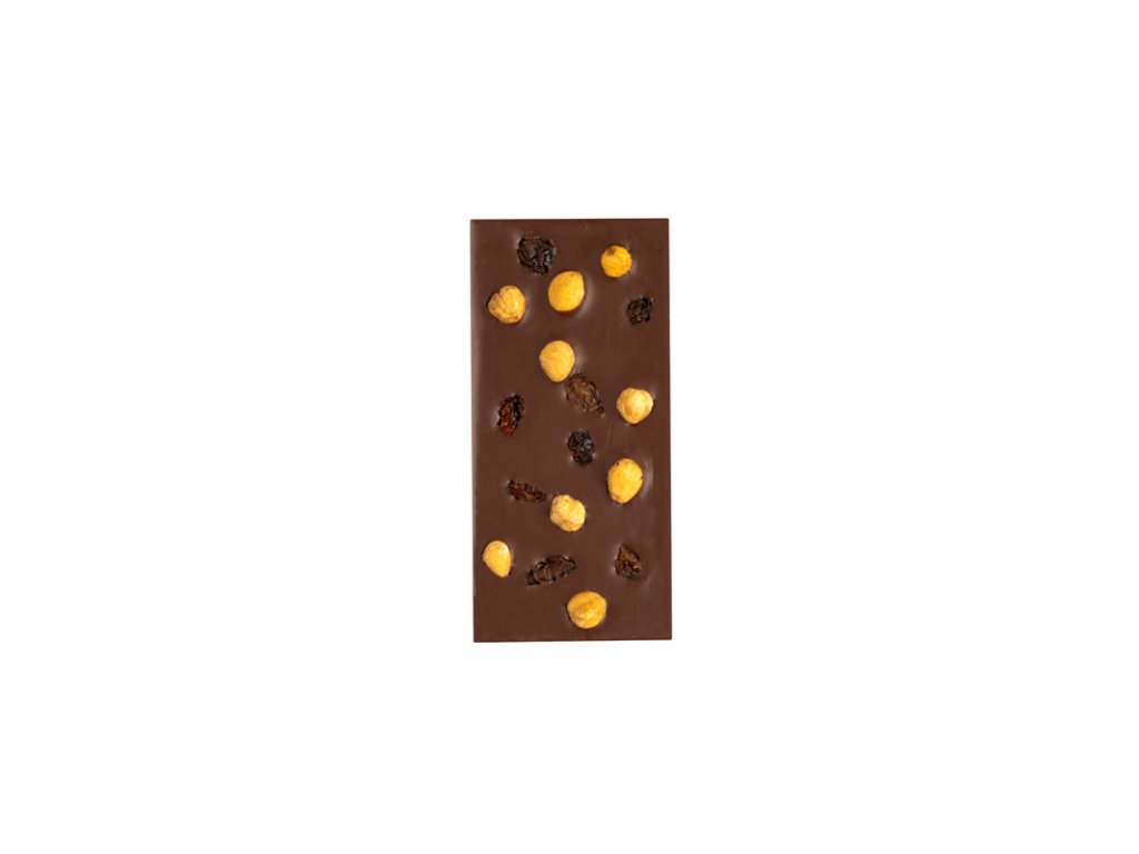 Vyrobená z tých najkvalitnejších kakaových bôbov criollo a trinitario z Južnej Ameriky. Ako jedna z mála čokolád na trhu neobsahuje sójový lecitín. Zvýšený obsah kakaovej sušiny podčiarkuje jej kvalitu a znižuje obsah cukru v tejto lahodnej čokoláde. Chuť je doplnená o lahodné čerstvo upražené lieskovce z Piemontu a šťavnaté hrozienka.