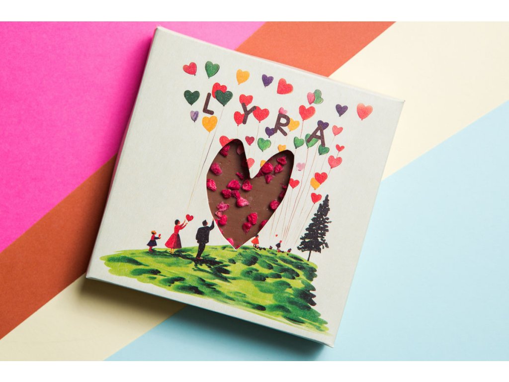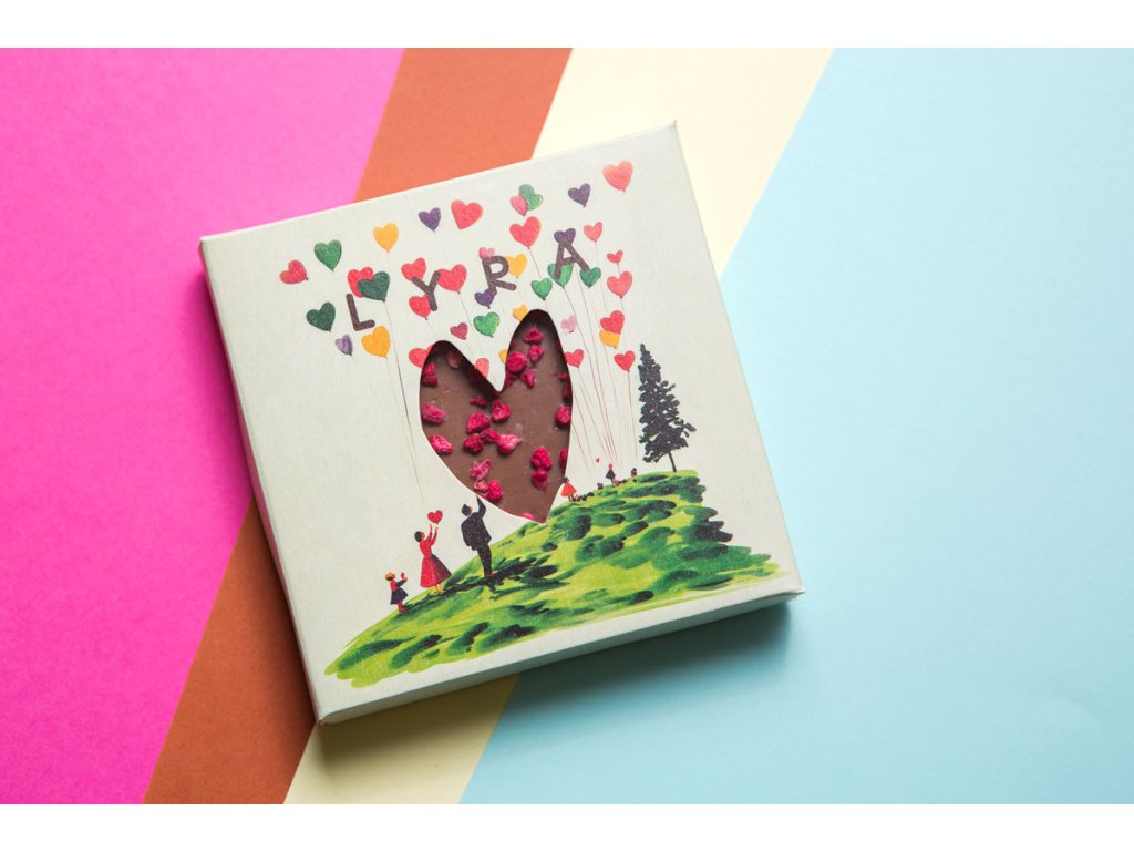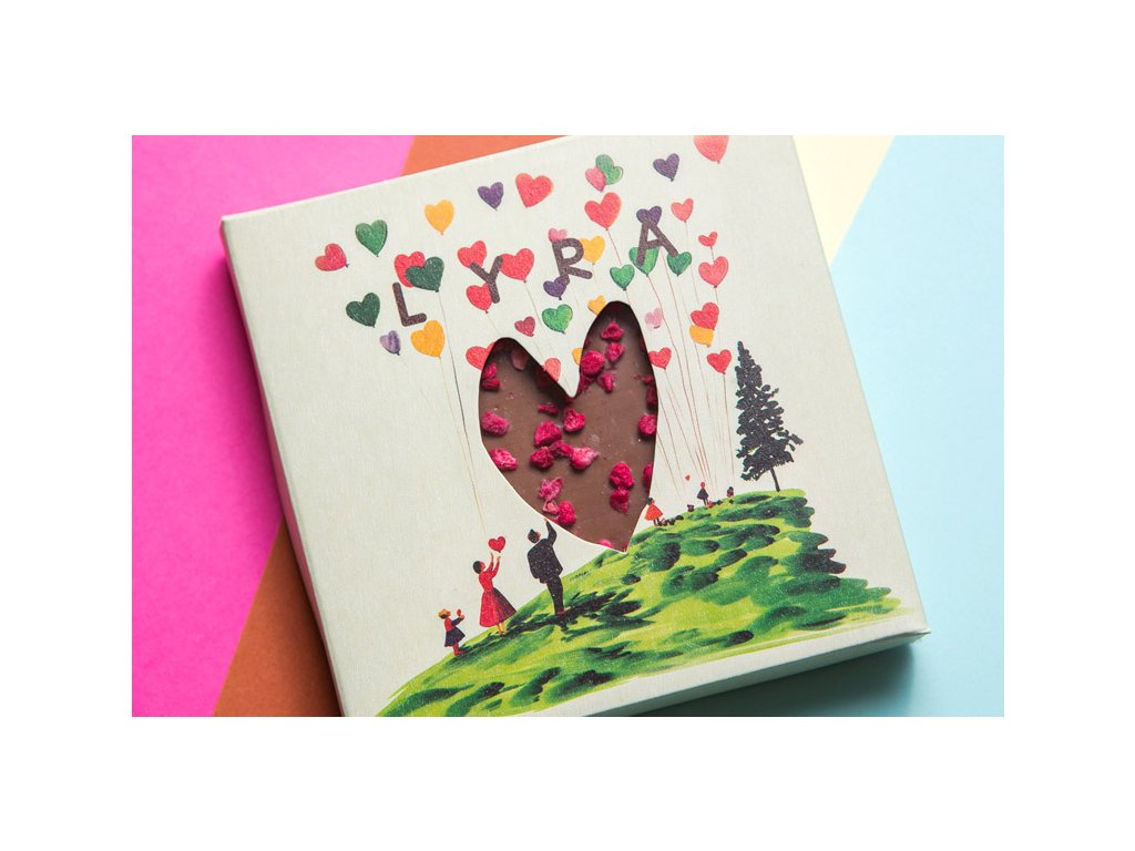 Slovenská Lyra mliečna čokoláda v tvare SRDCA s posypom malinových lupienkov. Hodí sa na výročie, Valentína, narodeniny alebo meniny vašej milovanej osoby.